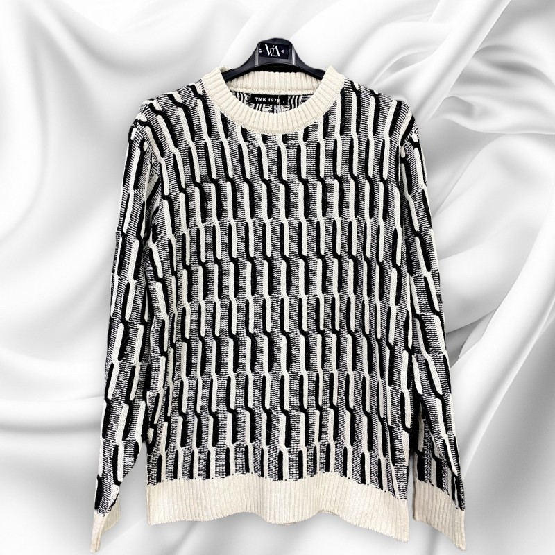 Maglione uomo con ricami in panna, fantasia olografica, girocollo, vestibilità regular.