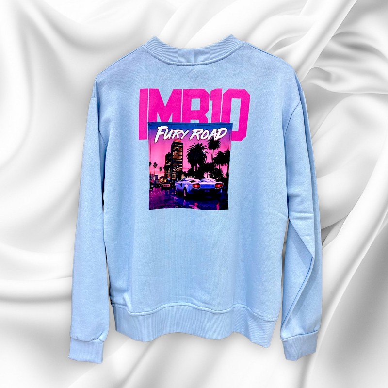 Felpa garzata all'interno, disponibile in azzurro e nero. Girocollo con polsini e stampa sulle spalle.